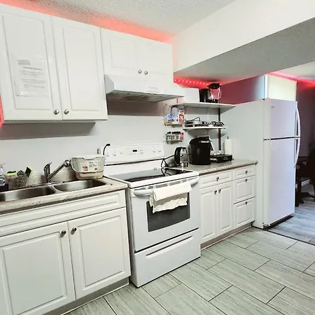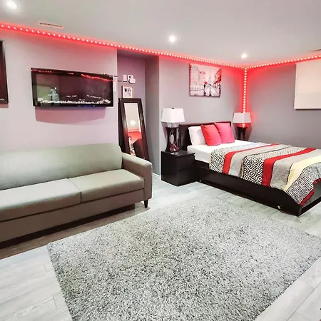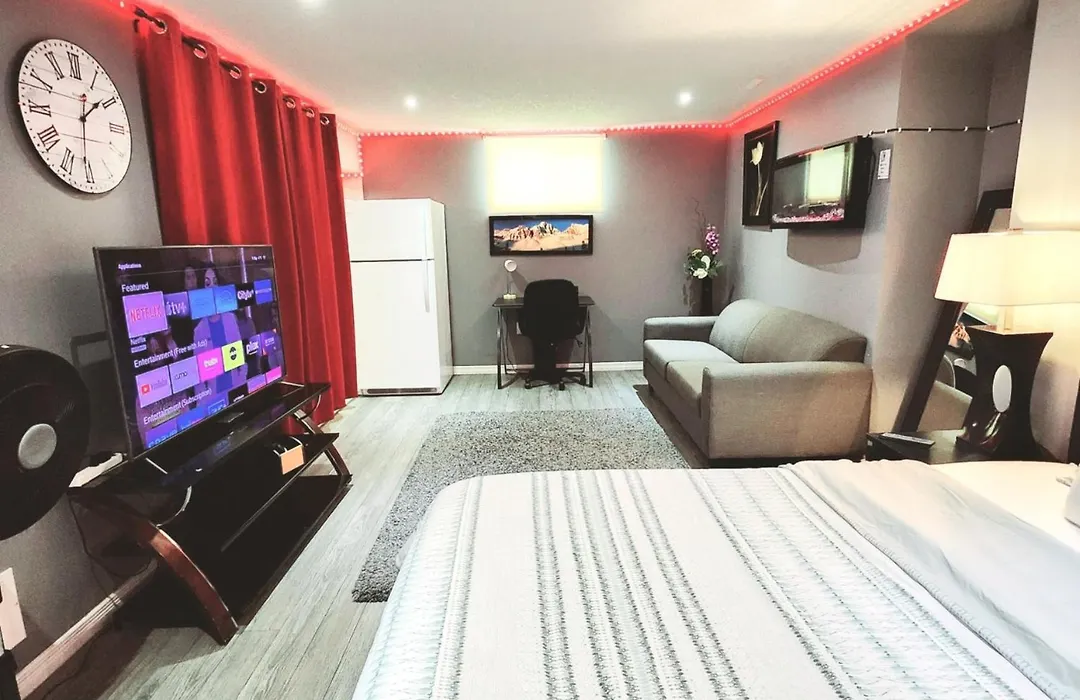 Staycation Apartment, Free Parking ,Kitchen & Washroom Ensuite heeft een bank en een bureau en is uitgerust met een satelliet-TV en een flatscreen TV met satellietzenders, strijkfaciliteiten, en voorzieningen zoals airconditioning. Tot de veiligheidsvoorzieningen op de kamer behoren rookmelders. De accommodatie bestaat uit 1 slaapkamer. Het appartement omvat 1 badkamer met een inloopdouche, een apart toilet en een badkuip, waar een haardroger en handdoeken worden er ook verstrekt.
